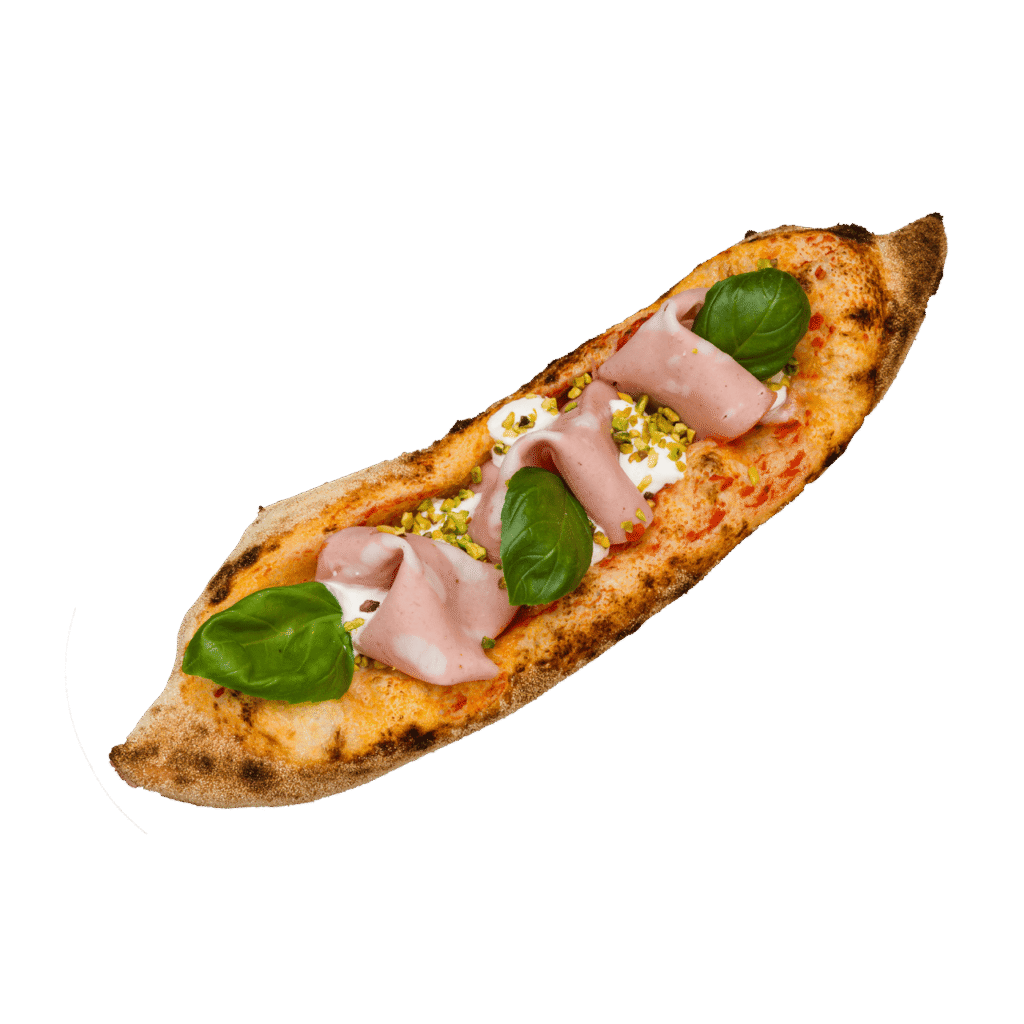 Făină, sos de roșii, busuioc, mortadella, fistic, stracciatella, ulei de măsline, zahăr, sare