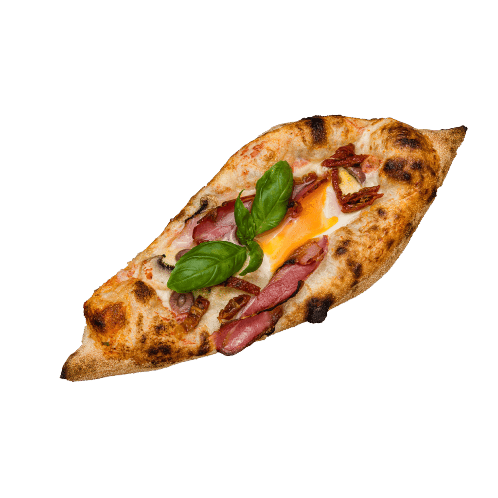 Făină, mozzarella fior di latte, sos de roșii, ou, pancetta, roșii uscate în ulei, ciuperci, măsline, busuioc, zahăr, sare