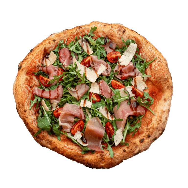 Făină, mozzarella fior di latte, sos de roșii, roșii, prosciutto crudo, ruccola, parmezan, crema balsanic, busuioc, zahăr, sare